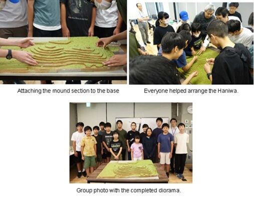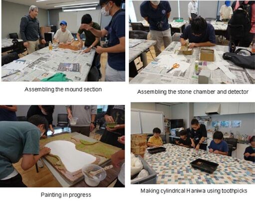 During the diorama-making session, participants split into three groups: one assembled the stone chamber and detector, another painted the mound and base, and the third made tiny cylindrical Haniwa dolls. The third group was guided by Professor TANAKA Yutaka at the College of Humanities and Social Sciences, Ibaraki University, observed actual cylindrical Haniwa excavated from Funatsuka No. 2. They learned about the features, roles, and placement of the Haniwa on the mound before crafting cylindrical Haniwa for the diorama.