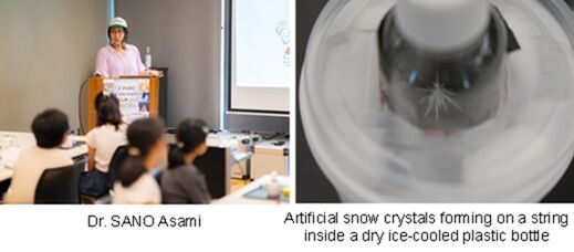 This year was the first time that “Transforming Water―Let’s Observe Snow Crystals” took place, in which participants built a Hiramatsu-style artificial snow generator. They moistened the inside of a plastic bottle, suspended a string with a small weight, and cooled the entire bottle using dry ice. This setup allowed them to observe how ice crystals―resembling snowflakes―gradually grew around the string. The workshop also featured an experiment showing how applying high pressure to water can produce a special form of solid water, known as high-pressure ice. Unlike ordinary ice, this phase has a unique molecular structure and remains stable only under extreme pressure.