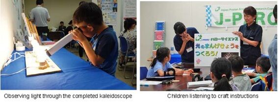 At the Japan Atomic Energy Agency booth within MEXT, children were introduced to J-PARC and participated in a craft workshop where they made a kaleidoscope of light. When they looked through their completed kaleidoscopes, the light sparkled in rainbow colors, and their faces lit up with joy. One child even wrote “J-PARC” on the back of their hand to remember it.