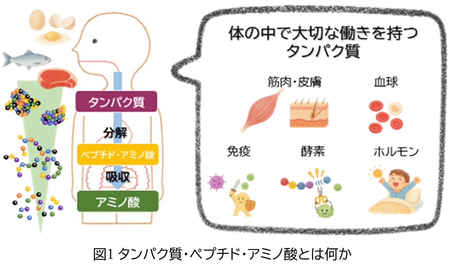 タンパク質やペプチドは生命活動を支える中心的な分子であり、医薬品開発や構造生物学研究の重要な対象です。多種のアミノ酸が鎖状につながったペプチドや、数十個以上がつながり立体的な構造をとるタンパク質は、筋肉や皮膚など身体を形作るだけでなく、酵素として食物の消化を助けたり、免疫やホルモンの前駆体 [7] として生理機能を調節する役割も担っています(図1)。