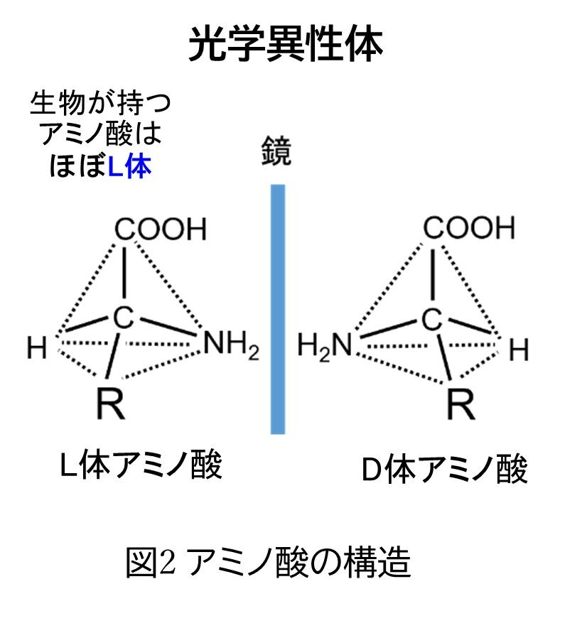 ほとんどのアミノ酸はその分子構造の特徴から光学異性体が存在し、L体とD体に区別できます(図2)。自然界に存在するアミノ酸はほとんどがL体アミノ酸です。一方で、D体アミノ酸は、細菌の細胞壁ペプチドや一部の海洋生物、哺乳類の脳内ペプチドなど、限られた場面でしか検出されません。その存在量もL体に比べてごく少量で、生合成経路も特殊です。一部のD体アミノ酸は抗菌作用や、微生物からの分解耐性などの特徴を持つと言われていますが、統一的な研究は進んでいません。
