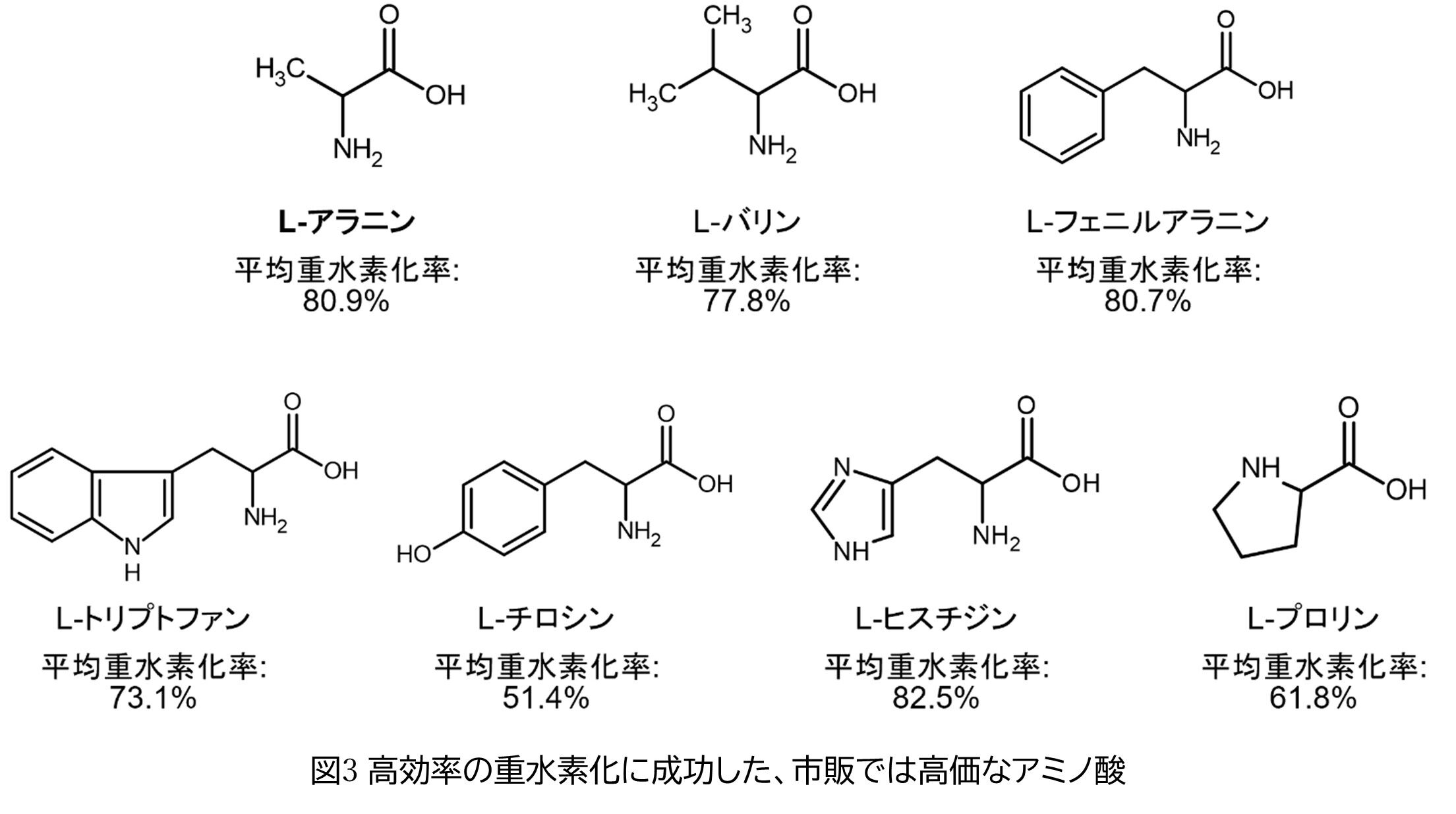 ✣ 重水素ラベル化法は、生化学、創薬、材料開発など幅広い研究分野で有効な手法とされています。アミノ酸においても同様に、実用的な重水素ラベル化法が求められていました。