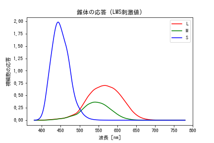 ここでは、 "Golz, J. & MacLeod, D. I. A. (2003). Colorimetry for CRT displays. Journal of the Optical Society of America A, 20, 769-781. " で公開されている錐体細胞の感度データの一つ(https://www.uni-kiel.de/psychologie/golz/publications/2003a/LMS_SMJ_2.dat) を使います。