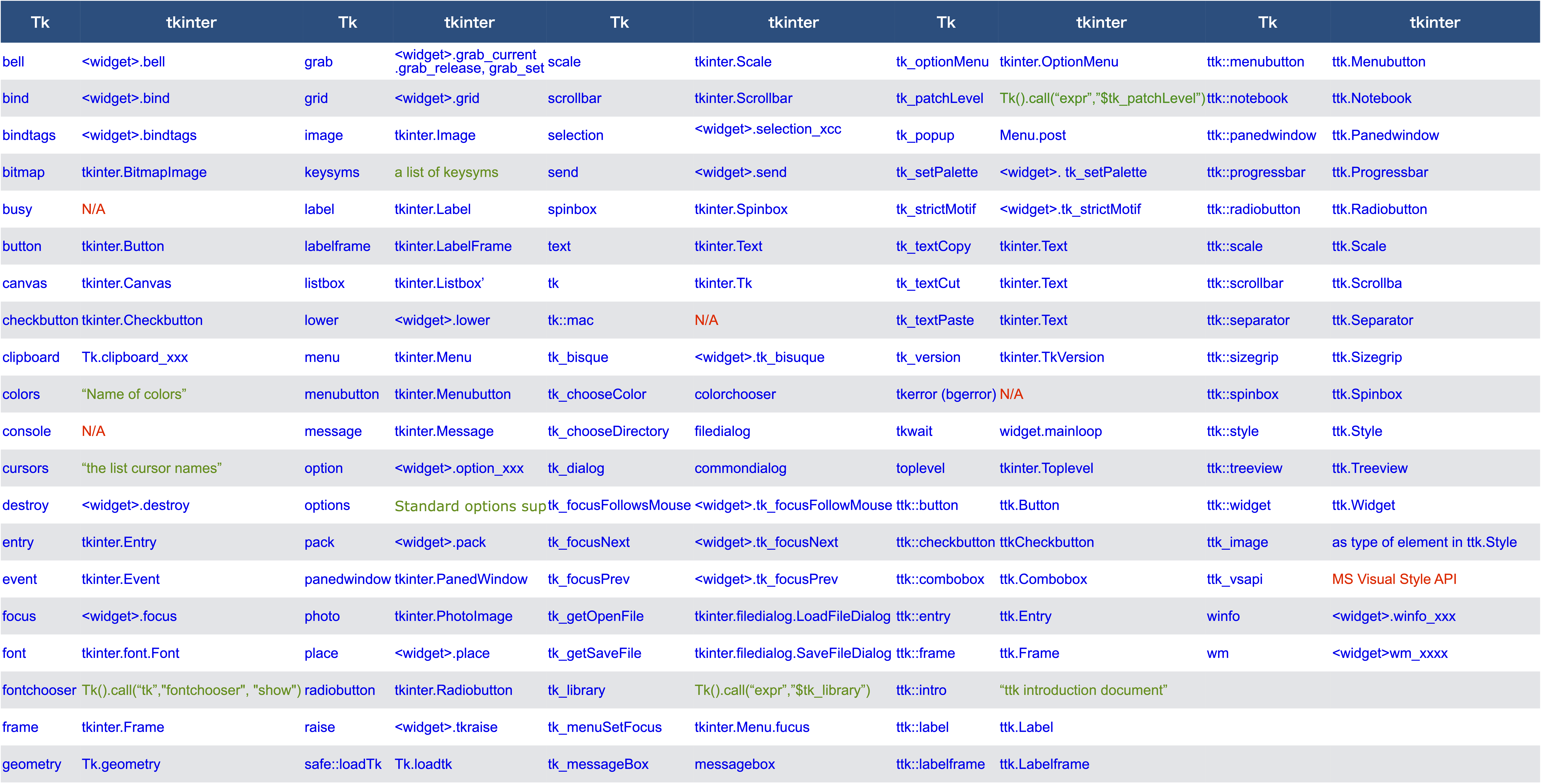 Tcl/Tkを利用するための python モジュール tkinter は pythonの標準配布パッケージの中に含まれていることから、よく使われています。(ドキュメントについては、公式ページでも”標準ドキュメントが頼りないものだとしても、代わりとなる、リファレンス、チュートリアル、書籍その他が入手可能です。”と述べています。)