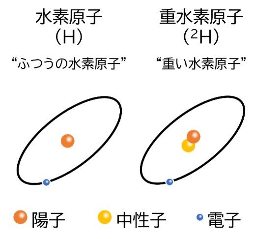 水素の「仲間(同位体)」の一つで、ふつうの水素(軽水素 H または1H)は原子の中心に小さな粒(陽子)を1個だけ持っていますが、重水素はそこに「中性子」という粒が1個加わり、2倍の重さになっています。そのため「重い水素=重水素 (2H)」と呼ばれます。この違いのおかげで、重水素を含む水(重水)には、普通の水とは違った性質があり、エネルギー開発に関連した科学研究や、さらには体内の仕組みを調べる道具として利用されています。