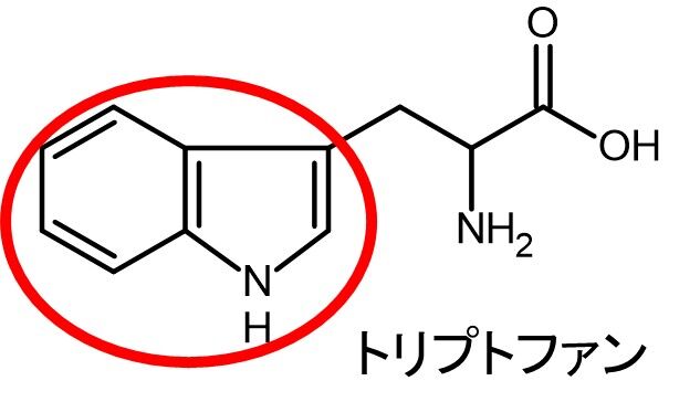 トリプトファンは、人体を作るアミノ酸20種類のうちの一つです。体内で合成できない「必須アミノ酸」で、食べ物から摂る必要があります。側鎖に「インドール環 [13] 」という独特の構造を持っており、このおかげで光を吸収しやすく、研究にもよく使われます。
