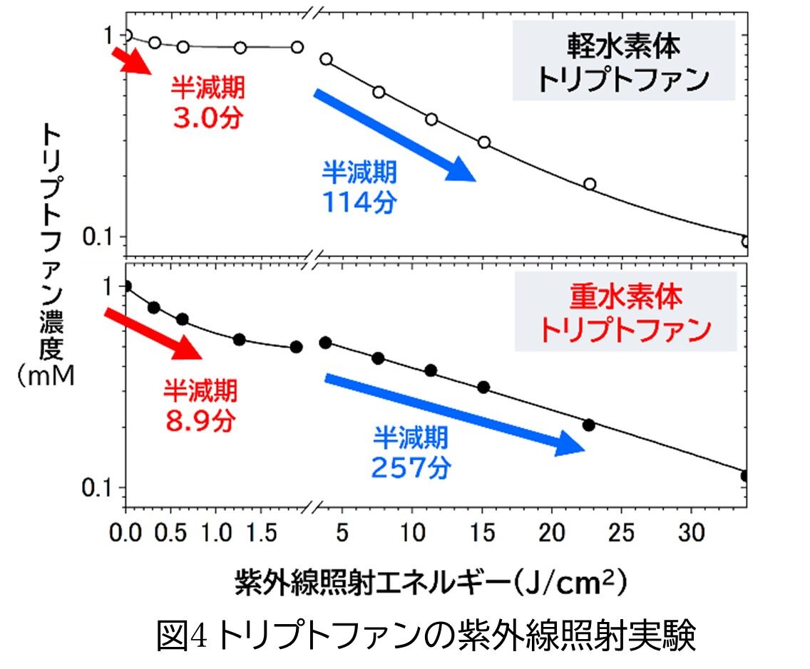 さらに、得られた重水素体トリプトファンの物性を調べました。トリプトファンは紫外線を吸収するとインドール環 [13] が分解されるため、他のアミノ酸に比べて光に不安定であるという問題があります。軽水素体と重水素体を比較すると、酸による分解速度には大きな差はありませんでしたが、紫外線を照射した場合には光分解速度が明らかに低下していることが分かりました。つまり、重水素化によって光分解が大幅に抑えられることが確認されました(図4)。