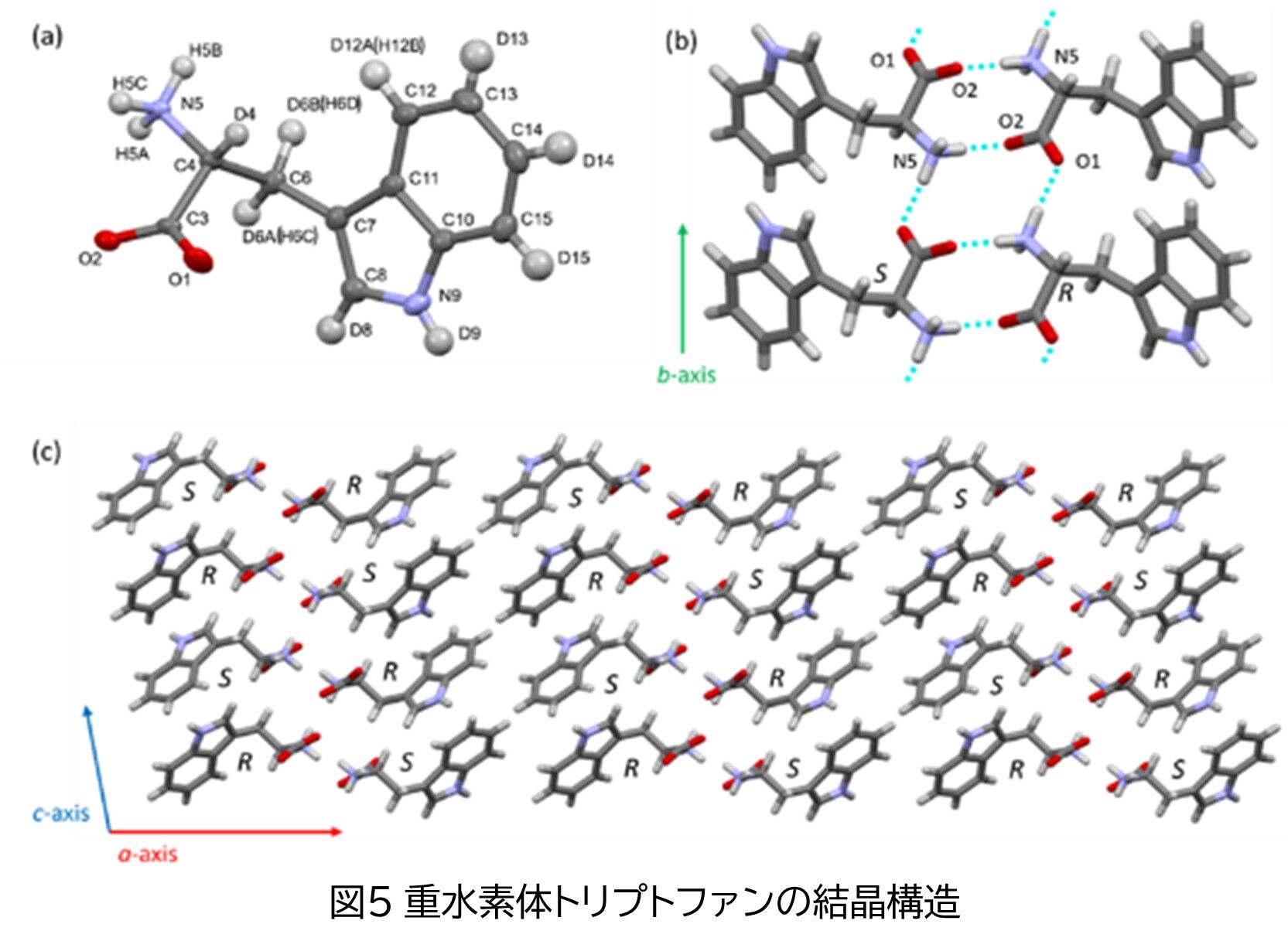 重水素体と非重水素体のトリプトファン結晶構造をX線による構造解析 [14] を用いて比較したところ、結合長や結合角、分子間距離に大きな差は認められませんでした。重水素化はトリプトファンの結晶構造そのものに大きな影響を与えないことが確認されました(図5)。