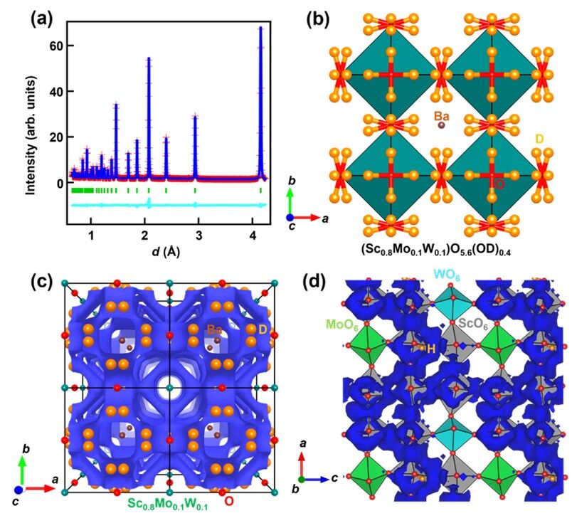 図4.(a)BaSc0.8Mo0.1W0.1O2.8の中性子回折データのリートベルト解析(用語9)図形、(b)精密化した結晶構造。(c)結合原子価法(用語10)で調べたプロトンのエネルギー図において青いエネルギー等値面が3次元に連結しており、3次元のプロトン拡散経路が分かる。(d)第一原理分子動力学計算で得たプロトンの分布図。プロトンがMoとWにトラップされず、Scに近接した酸素原子の間をホッピングして移動することが分かる。©著者ら(2026)