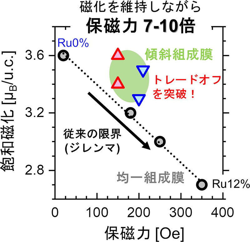 従来の均一な材料(黒丸)は、ルテニウム(Ru)添加量を増やすと保磁力は高くなるが、磁化は点線に沿って大幅に低下する。これに対し、今回のナノ傾斜組成膜(赤・青の三角)は、Ruを含まない「Ru0%試料」と同等の高い磁化を保ちつつ、保磁力のみが横軸方向に大きく右側(従来の7〜10倍)へ移動しており、これまでの限界を超えたことを示している。
