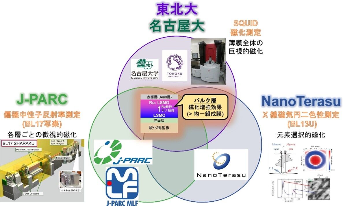 さらに、この高性能化のメカニズムを明らかにするため、東北大学による巨視的な磁化測定に加え、J-PARC MLF(注3)BL17の中性子解析とNanoTerasu(注4)BL13Uの放射光解析を組み合わせた相補的解析を実施しました(図3)。これにより、材料全体の磁気特性の変化と、膜内部の傾斜各層や特定元素が示すミクロな磁気状態とを、ナノスケールで直接対応付けて評価することが可能となりました。