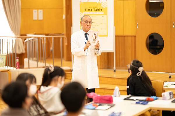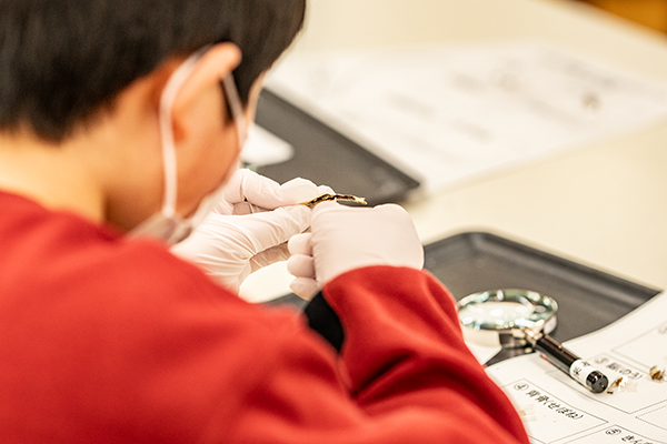 小学校4年生の理科では「わたしたちの体と運動」の単元で、人の体の構造について学習します。参加した児童の皆さんは、顕微鏡を使ってミジンコの動きを観察したり、虫めがねを使って、解剖中のにぼしの体の各部分を観察することで、生き物の体の構造を通して「命」について学習しました。積極的に質問する児童も多く、非常に有意義な授業となりました。