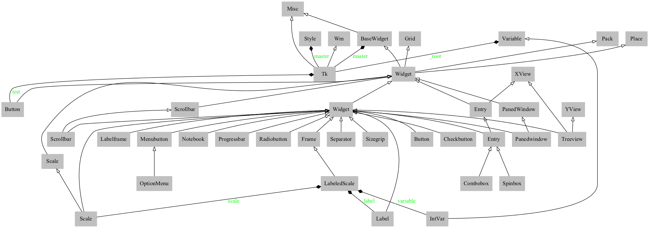 これらのオブジェクトでは、ラベルはそれぞれ異なりますし、押した時の動作も異なりますが、その他は同じような働きをしています。つまり、これらの部品がオブジェクト(表示窓の中に使われる部品、オブジェクトということで、 ウィジェット(Widget=window+object)と呼ばれます)。 ttk.Buttonは、これらのオブジェクトがもつ同じ性質(同じクラス)につけられた名前(クラス名)です。