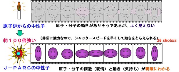J-PARCの中性子ビームは強力です。ストロボを照らしながら写真を撮るように、今まで見えなかった動きの速い変化などもとらえることができます。また測定時間の短縮なども可能になります。