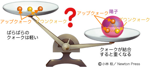 ばらばらのクォークは軽いのですが、結合して陽子などの「ハドロン」になると、なぜか重さ(質量)が100倍くらいになってしまうのです。1+1+1=100!? なぜそうなるのか、よく解っていません。