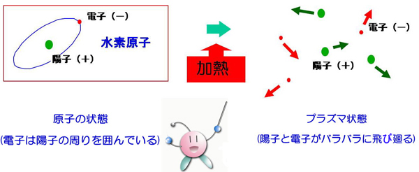 水素をどこかに閉じこめ、ヒーターなどで、どんどん温度を上げていくと、やがて原子の運動が活発になって、陽子と電子がバラバラに飛び廻る状態になります。これを「プラズマ」と呼びます。