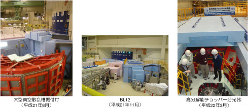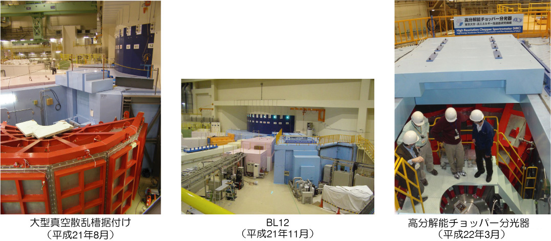 - BL12ビームラインでは、主として物質科学の研究を行う。新しく開発したチョッパーと呼ばれる装置を用いて実験に必要なエネルギーの中性子を自在に選別し、高精度 (高分解能) の実験を実現する。装置の高精度化が可能になると、高いエネルギー領域の中性子を利用することが可能になり、これまで測定が出来なかった時空間での観測が実現する。また、物質内の原子・分子の運動やスピンのダイナミクスを高精度でとらえることができるようになり、様々な現象の機構を明らかに出来、優れた磁性材料などの開発が期待されている。