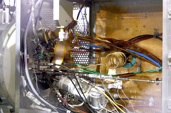 リニアックでは、後段の RCS において荷電変換入射 (負水素イオンから電子を剥ぎ取って陽子イオンとして円形加速器にビームを入射する) を行うために、負水素イオンを加速しています。イオン源では、水素ガスと高周波電磁場との相互作用で生成した水素プラズマに対して、水素に電子を付加する作用のあるセシウム蒸気を添加することで負水素イオンを生成しています。イオン源内部で生成された負水素イオンは、50 kV の電場により初段の加速器である RFQ に向かってビームとして引き出されます。