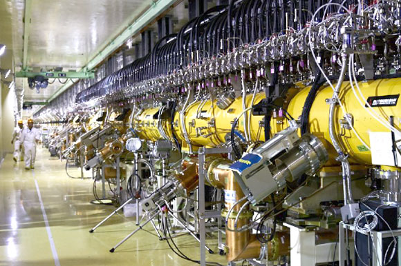 J-PARC の加速器施設のビーム入射器となるリニアックで、ピーク電流 50 mA という大電流の負水素 (H-) イオンを生成し、ビームとして加速しています。リニアックを構成するのは、主な装置は負水素イオンを生成するイオン源と高周波電場によりビームを加速する加速空洞です。加速空洞には、加速されるに従って速くなるビームの速度に応じて最も効率的にビームを加速できる電場を生成するために4 種類の構造 (RFQ, DTL, SDTL, ACS) を持ったものを採用しています。これらの加速空洞を使用することで、250 m 程の加速区間で負水素イオンビームを 400 MeV (メガエレクトロンボルト) まで加速し、後段の RCS にビームを受け渡しています。