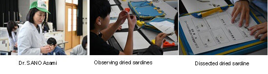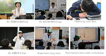 With the slogan “The first step in research is to look closely!” the children challenged three themes: (1) dissecting dried sardines, (2) looking at the swimming masters, water fleas, and (3) the secrets of natto.