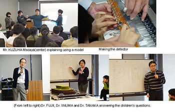 Making the detector was again delicate and nerve-wracking work, but after listening to the reports of the analysis results, everyone is more enthusiastic than ever to make an even better detector. In addition to Mr. KUZUHA, Dr. FUJII from J-PARC and Dr. IINUMA and Dr. TANAKA from Ibaraki University also took part in the children’s question corner.