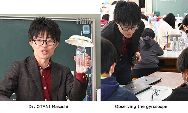 Dr. OTANI explained elementary particle research at J-PARC using gyroscopes and self-assembled spinning tops. A top that continues to spin while tilted, and the axis of the top rotates with the top itself. This movement, known as precession, changes the direction of rotation of the axis when the center of gravity of the top is changed. Through the observation of the tops, we hope that the students have been able to sense the existence of subatomic particles.