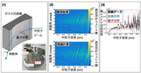 図1 (1) ガラス凹面鏡に入射する中性子ビームと凹面鏡表面に作られる量子状態の模式図と写真。 (2) 量子状態の観測結果と理論計算との比較。古典力学の場合は点線で囲まれたくさび形領域の内側に一様に分布します。(3) 図1(2)の発散角-0.1から0.1 mradの範囲を抜き出した分布。実験データが量子力学の曲線とよく合っていることが分かります。