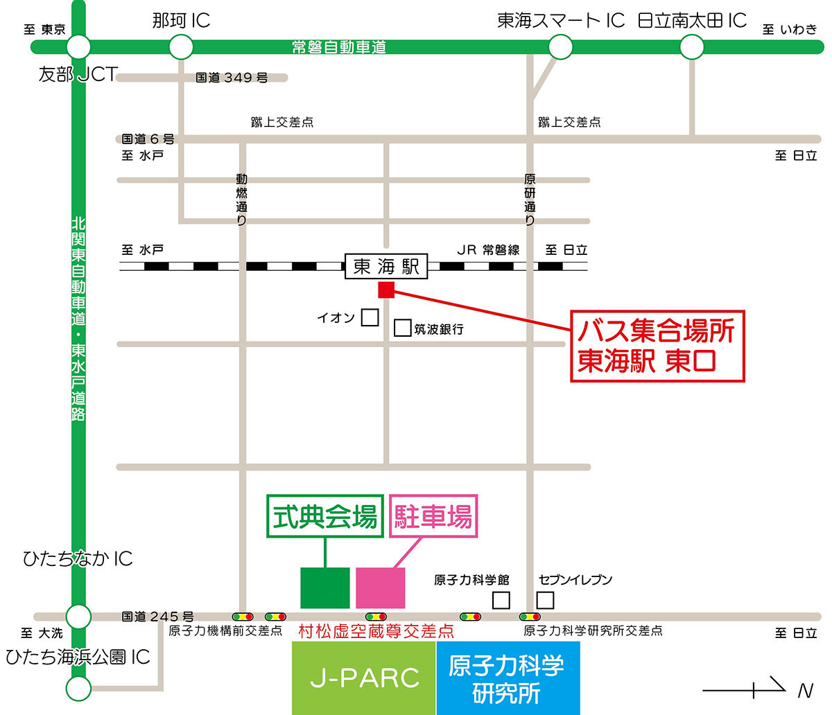 東京方面から電車でお越しの方は、8:30上野発(JR特急ときわ53号)→9:55勝田着、(乗り換え)10:11勝田発(JR常磐線)→10:19東海着をご利用の場合、東海駅東口10:25発にて会場まで送迎バスをご用意する予定です。