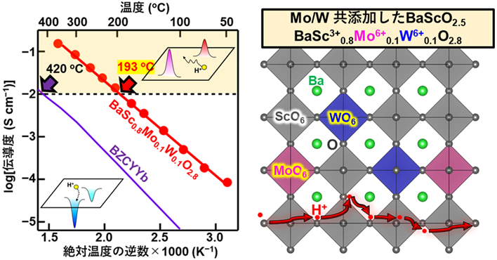 図1. 本研究では、BaScO2.5にMo/Wをドナー共添加することで創製したBaSc0.8Mo0.1W0.1O2.8が、193℃において 10-2 S cm-1に達する超プロトン伝導度を示すことを報告する(左図の赤い丸と線)。アクセプター共添加したBZCYYbよりBaSc0.8Mo0.1W0.1O2.8のプロトン伝導度は高い。高いプロトン伝導度は、高いプロトン濃度およびプロトン移動経路(右図赤矢印)の形成による高いプロトン拡散係数に起因する。©著者ら(2026)