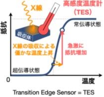 X線を吸収した際のエネルギーを、微小な温度上昇として測定する装置(マイクロカロリメータ)の一種であり、温度センサーとして超伝導体を用いる。超伝導体は転移温度付近で電気抵抗が急激に変化するため、わずかな温度変化を高感度に電気信号として検出できる。この特性を利用することで、TES検出器は極めて高いエネルギー分解能を実現し、従来の半導体検出器では識別が困難であった微細なスペクトル構造の観測を可能にする。