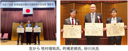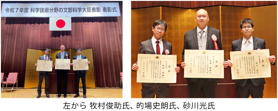 ミュオンセクションの的場史朗氏、牧村俊助氏(現ハドロンセクション)、砂川光氏の3名が、「世界最大強度パルスミュ オン源の安全安定運用への貢献」という業績において、高度で専門的な技術的貢献を通じて研究開発の推進に寄与する活動を行い、顕著な功績をおさめたとして、令和7年度科学技術分野の文部科学大臣表彰 研究支援賞を受賞しました。4月15日に表彰式が行われました。