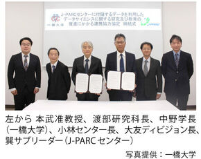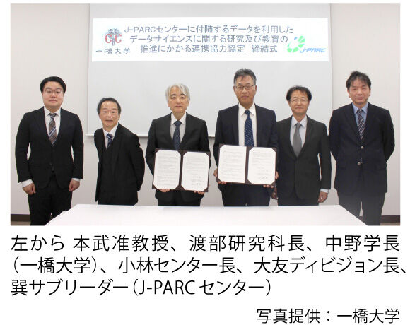 JAEA門馬理事とKEK道園理事の出席の下で、一橋大学の中野学長と小林センター長が、「J-PARCセンターに付随するデータを利用したデータサイエンスに関する研究及び教育の推進に係る連携協力協定」の締結に係る署名を交わしました。本活動は、J-PARCセンターのデータ利活用の取り組みの一環として注目され、産業や学術での同センターの貢献をより一層進めるものと期待されます。