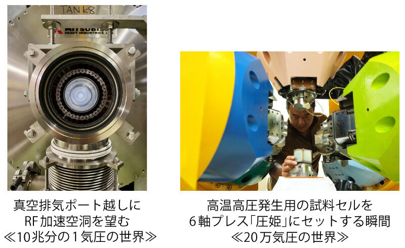 一方、地球は深部に行くほど圧力は高くなり、中心に近づくと360万気圧にも達します。この深部の様子を模擬するため、J-PARCの超高圧中性子回折装置「PLANET」では、「圧姫」というプレス機を使って、約20万気圧までの超高圧を実現しています。