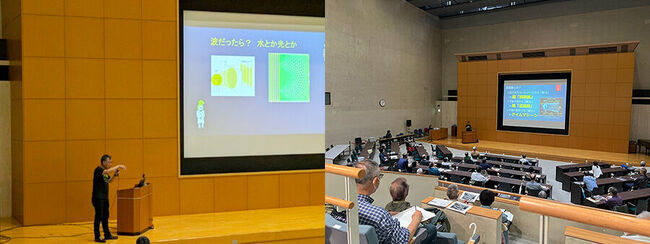 放送大学 茨城学習センターでは、「ライブラリー講演会」と称して、茨城県立図書館で年間9回の講演会が行われています。今年度は第1回として、小林 隆センター長が「茨城が誇る世界最強加速器J-PARCでさぐる宇宙と物質の起源」と題し、J-PARCの研究内容をわかりやすく講演しました。参加者は50名を超え、メモを取りながら熱心に聴講しました。講義後には、聴講者から、「どうしてニュートリノと反ニュートリノを区別できるのか?」「宇宙からのニュートリノと、J-PARCから発射したニュートリノを神岡ではどう区別するのか?」などの質問があり、小林センター長は大きなスクリーンに映し出された資料を指しながら、「反ニュートリノは、スピンの向きが逆である」「J-PARCからのニュートリノは発射時刻を正確に測定しているので、神岡の到着時刻も把握できる」と回答をしました。