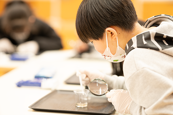 小学校4年生の理科では「わたしたちの体と運動」の単元で、人の体の構造について学習します。参加した児童の皆さんは、顕微鏡を使ってミジンコの動きを観察したり、虫めがねを使って、解剖中のにぼしの体の各部分を観察することで、生き物の体の構造を通して「命」について学習しました。積極的に質問する児童も多く、非常に有意義な授業となりました。