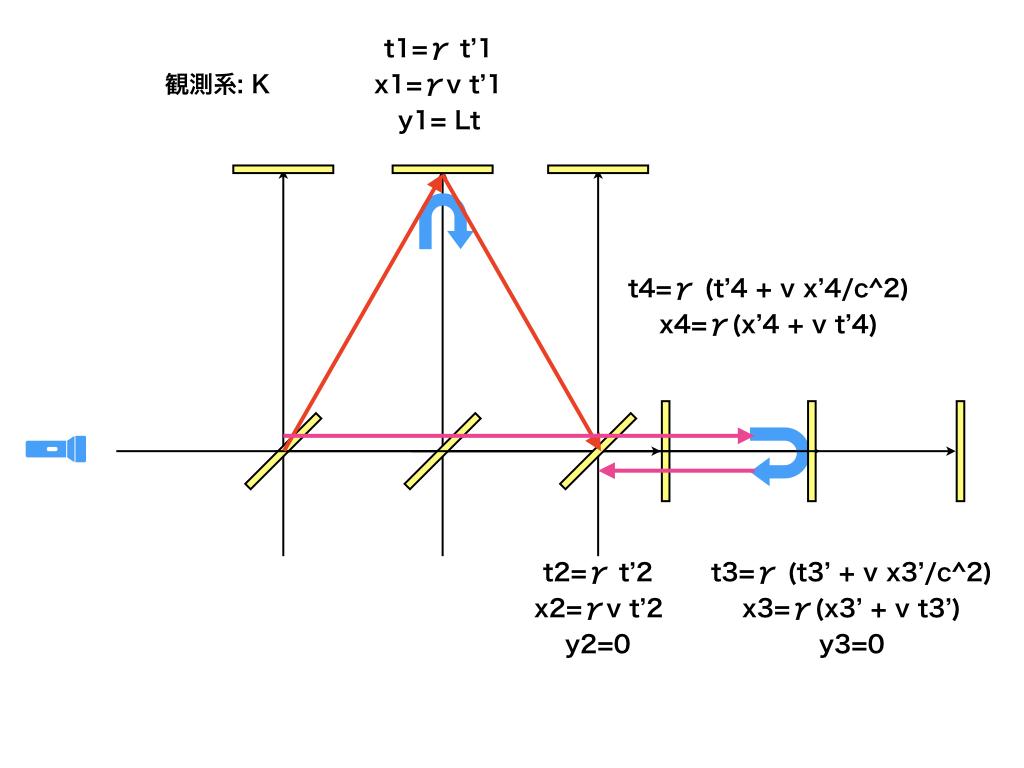 この結果は、mirror 2で反射される光が干渉計に戻ってくる座標をローレンツ変換によって求めても