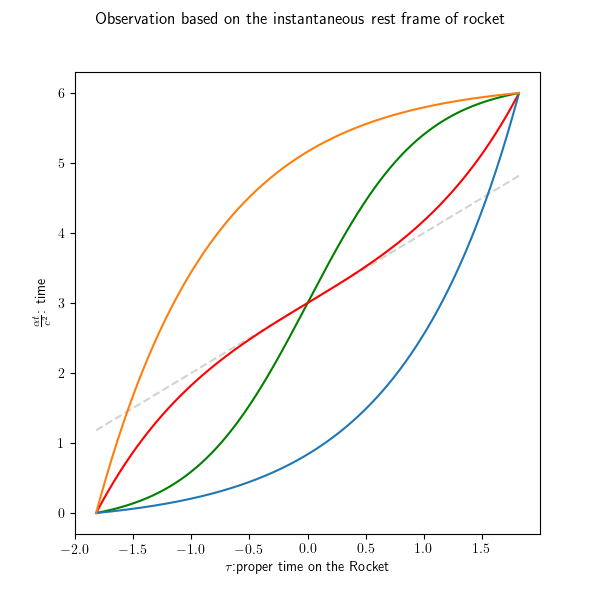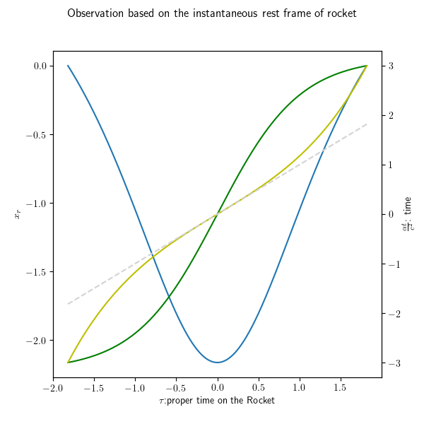 です。 この式から折り返し点付近( \(\tau \sim 0\) つまり \(u \sim 0\) )では、 \({\tilde t}\) は \(\tau\) よりも早くすすむことが分かります。またこの進み方は、折り返し点でのロケットから地球までの距離と加速度の積に比例する項がが存在します。これは重力ポテンシャルに相当する量です。出発時や到着時には