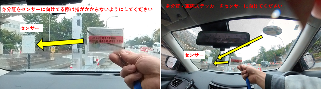 手順1: 電子タグ付き車両通行証をゲートのセンサーで検知できる位置(例:バックミラー部、ダッシュボードの上など)に設置してください。