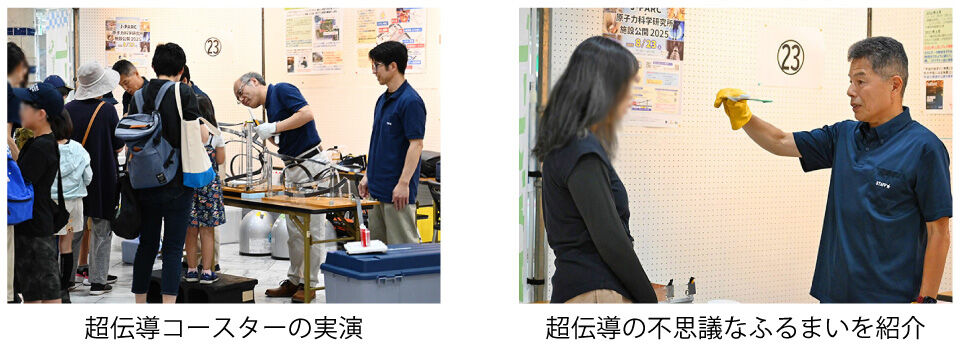 今回も低温セクションは磁石の滑り台と超伝導コースターの実演を行い、ブースには337名の方が足を運んでくださいました。金属の種類や温度で磁石の落下速度が変化する滑り台や、マイナス200℃近くまで冷やされた超伝導物質がマグネットのレールの上を滑るように駆け抜ける超伝導コースターに、幅広い世代の方々が「不思議」「面白い」と目を輝かせていました。
