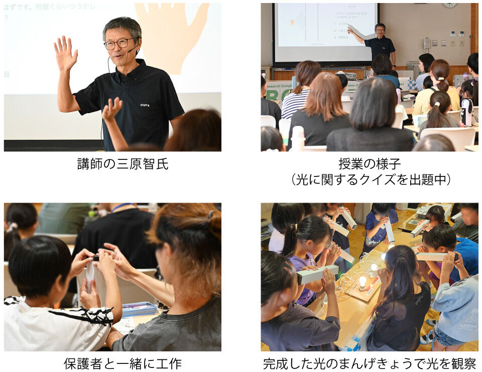本出張授業は、油縄子小学校3年生の親子学習会として日立シビックセンターより依頼を受けたもので、34名の児童とその保護者は、親子で一緒に波や量子から光について学び、光の性質を応用したまんげきょうの工作を行いました。