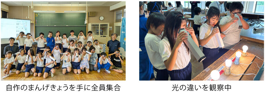 伊多波氏が児童への質問も交えながら講演を行い、波や光の性質について学んだ後、澤田氏とともに光のまんげきょう作りを行いました。自作のまんげきょうを光源に向けた際浮かび上がる虹色を見て、歓声があがっていました。