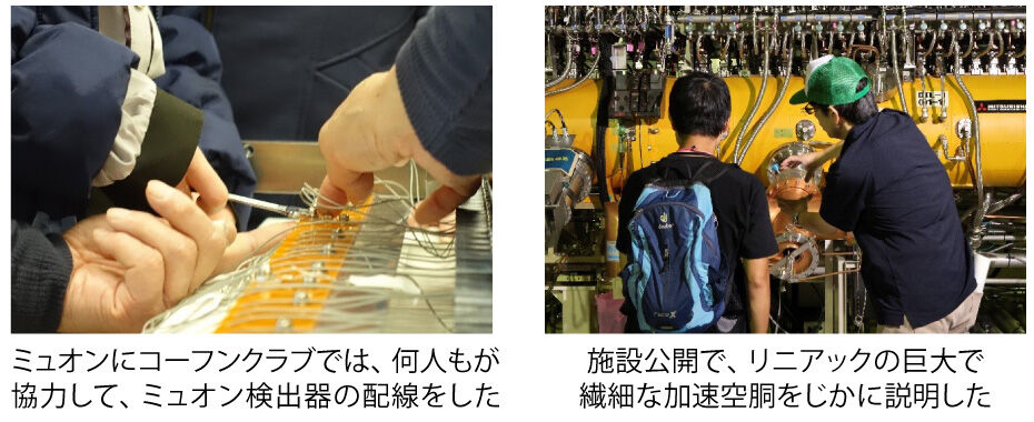 施設公開では、皆様が加速器施設や実験施設の中を歩いてその大きさを実感され、様々な装置や展示を見て触れてその複雑さを改めて感じられた方も多いかと思います。日本刀の展示では、光の当たり方によって静かに揺らめく刃文に見入った方もいらっしゃったはずです。出張授業では、子どもたちが指先を器用に使って光のまんげきょうを作りました。ミュオンにコーフンクラブでは、何人もの小中高生が協力してひとつのパネルの上に何百箇所もの配線をし、大掛かりな検出器を完成させました。講演会やJ-PARCハローサイエンスでは現場の研究者と、皆様の興味や疑問を共有する場を作っています。
