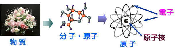 全ての物質は原子からできています。初めは、ひとつのかたまりだと思われていた原子ですが、研究が進み、よく調べてみると、原子のまん中に原子核と言うものがあって、その周りを電子が取り囲んでいることがわかりました。