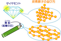 原子は面白い性質を持っています。同じ原子でも並び方が違うだけで、全く別な物質になってしまうのです。例えば、鉛筆の芯に使っている黒鉛という物質は、炭素という原子がきちんと並んでできています。